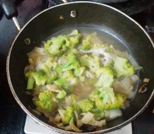 ಬಾಣಲೆಯಲ್ಲಿ 2 ಚಮಚ ಬೆಣ್ಣೆ ಹಾಕಿ ಹೆಚ್ಚಿದ ಈರುಳ್ಳಿ, ಬೆಳ್ಳುಳ್ಳಿ, ಶುಂಠಿ ಹಾಕಿ ಹುರಿದು ಬ್ರೊಕ್ಲೀ ತುಂಡುಗಳನ್ನು ಹಾಕಿ ಸ್ವಲ್ಪ ನೀರು ಹಾಕಿ 8 ರಿಂದ 10 ನಿಮಿಷ ಬ್ರೊಕ್ಲೀ ಸಂಪೂರ್ಣವಾಗಿ ಬೇಯಿಸಿ.